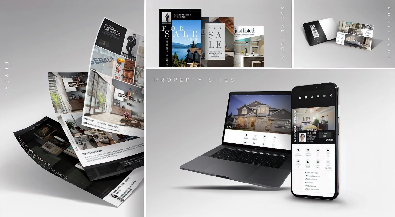 Pre-designed property sites, optimized social media reels videos, engaging graphics, teaser videos, property flyers, analytics